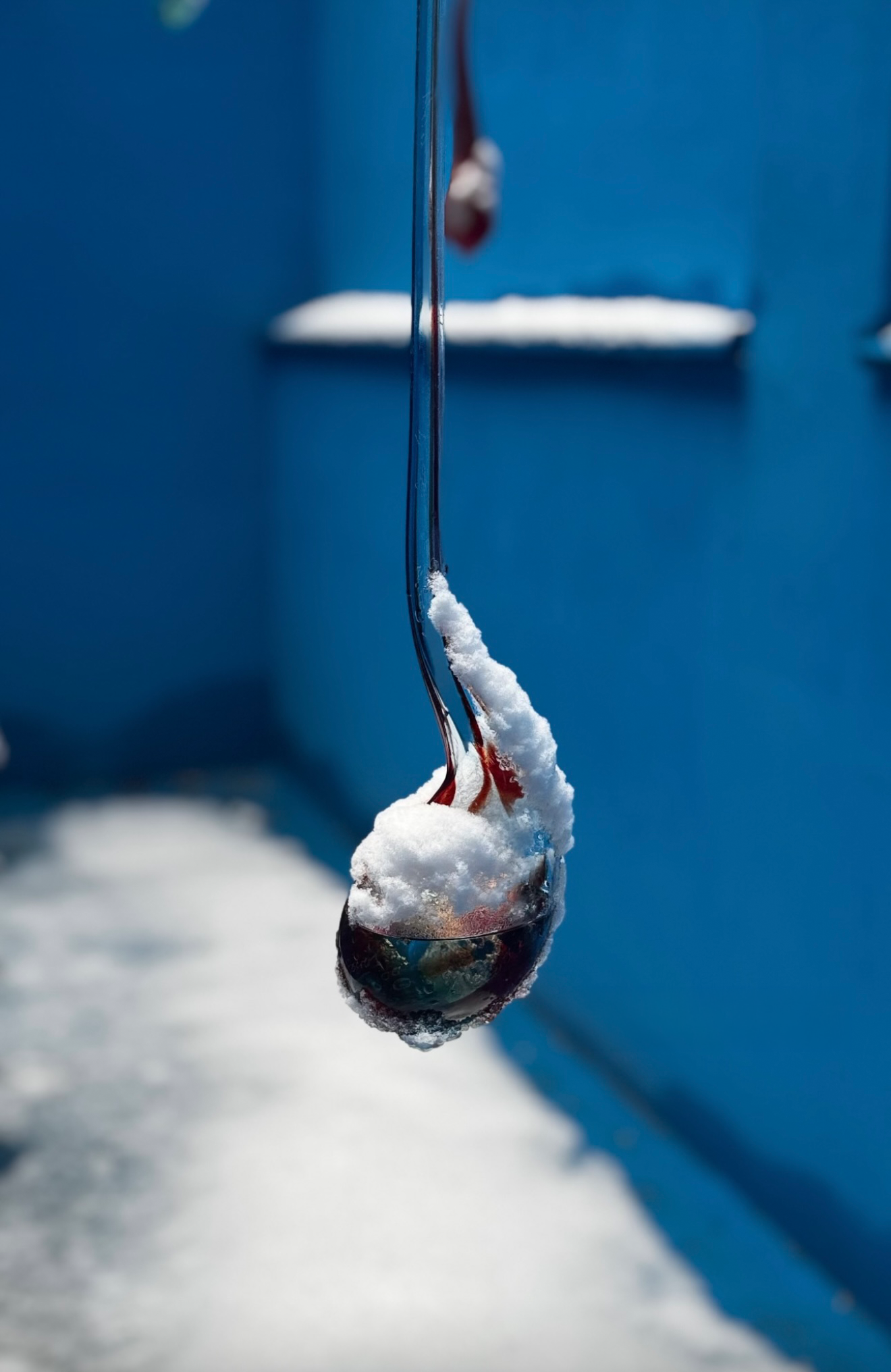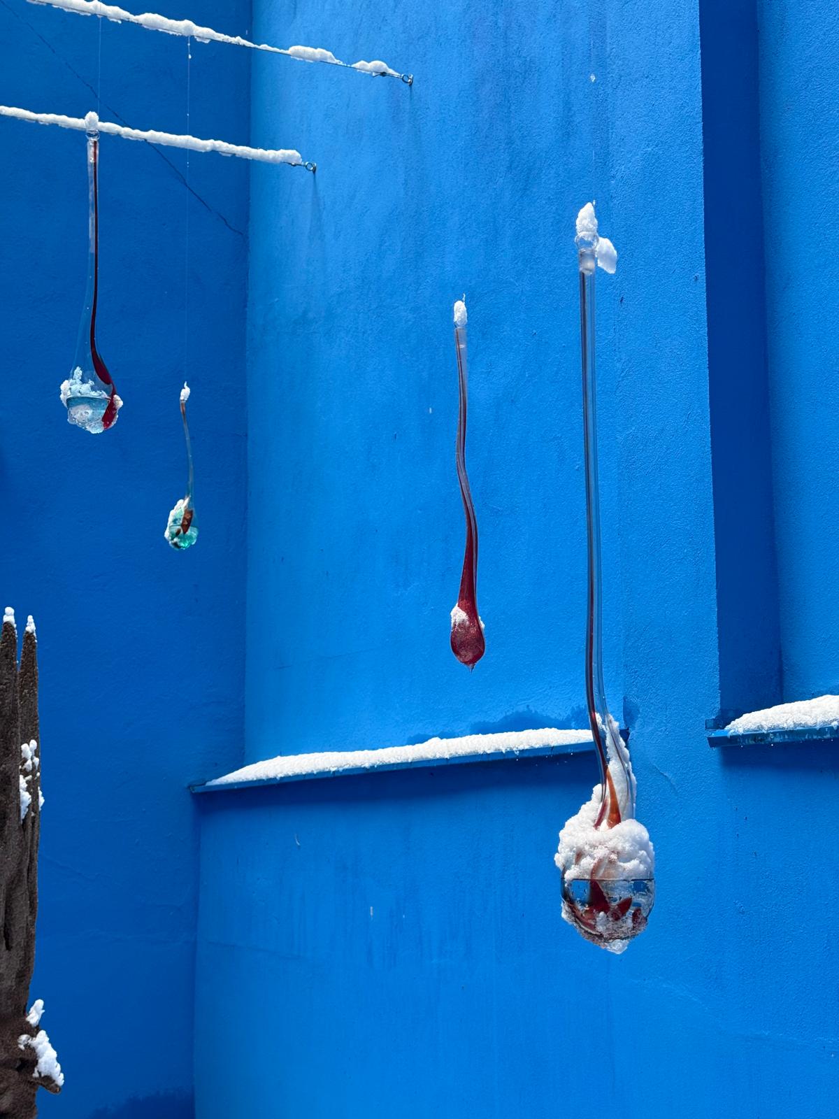 Installed in the Blue Room, in the exterior space of Galerie Kandlhofer in Vienna, the works unfold within a threshold between inside and outside, intimacy and exposure. The Desiring Machines (2025) consist of individual mouth-blown ruby-red glass drops filled with ethanol and inscribed with handwritten engravings. Suspended in the open air, the fragile glass bodies respond subtly to light, temperature, and atmosphere, emphasizing their material vulnerability and permeability.