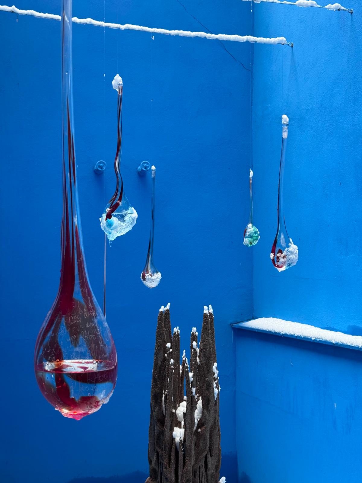 Drawing on Anti-Oedipus by Gilles Deleuze, Fürnkäs examines the body as a site of circulation, production, and desire — a system of flows rather than fixed identities. The drops, at once sensual and mechanical, evoke desiring machines: entities that connect, interrupt, and generate currents. In the blue spatial setting, they appear almost weightless, like condensed thoughts or distilled emotions.