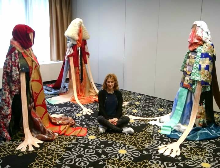 Her characters, only vaguely outlined as figures with fabrics, furs, and textiles, somewhere between haute couture and an old clothing collection, welcome the hotel guest in the entrance lobby, whose glass doors open and close as if by magic. From here, where the artist creates an oppressive opponent, draped with blood-red tulle and shriveled furs, she accompanies the visitor with her five works up the stairs just behind the reception desk above the bar, where she places an ambivalent observer beside the lonely guest at the counter.