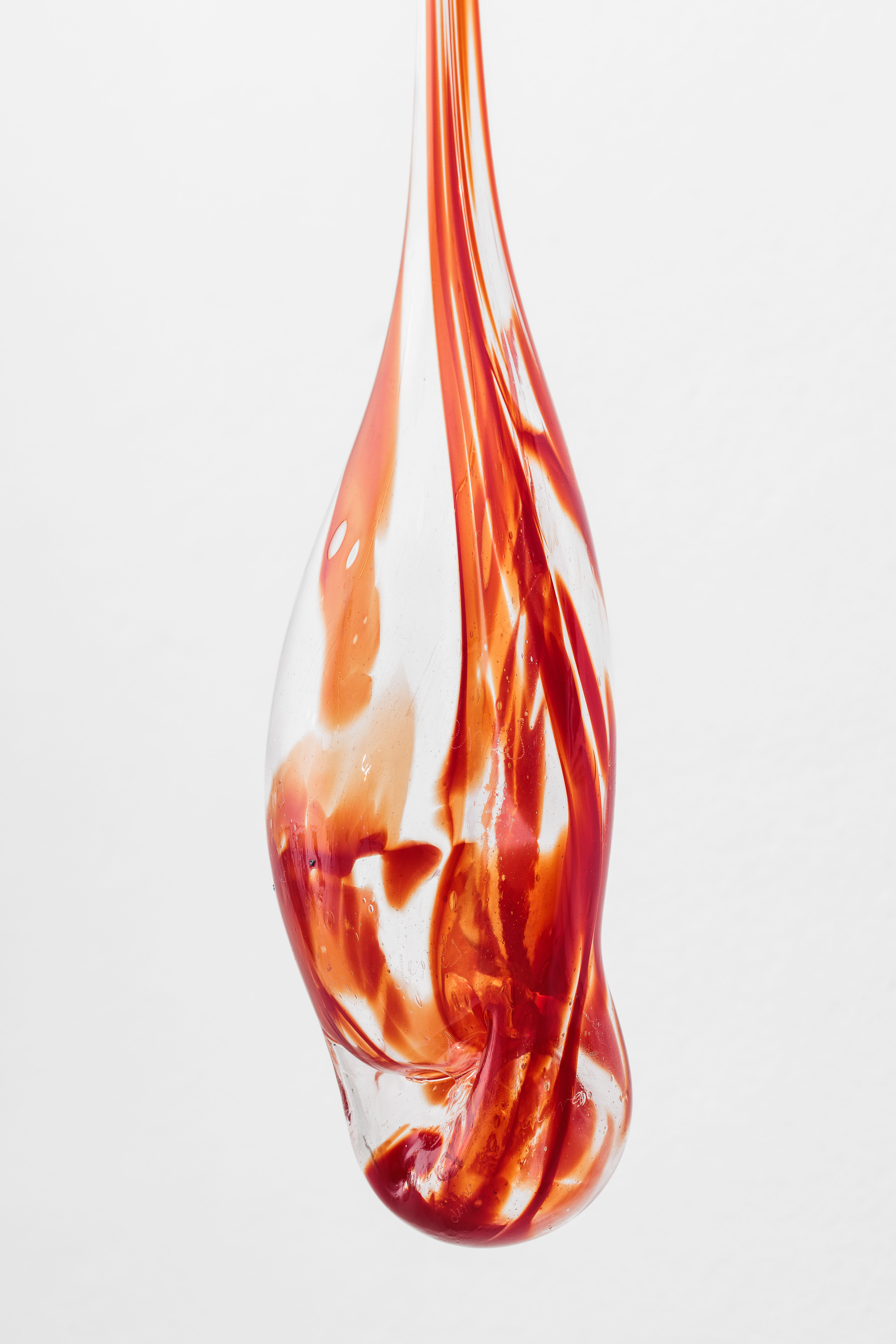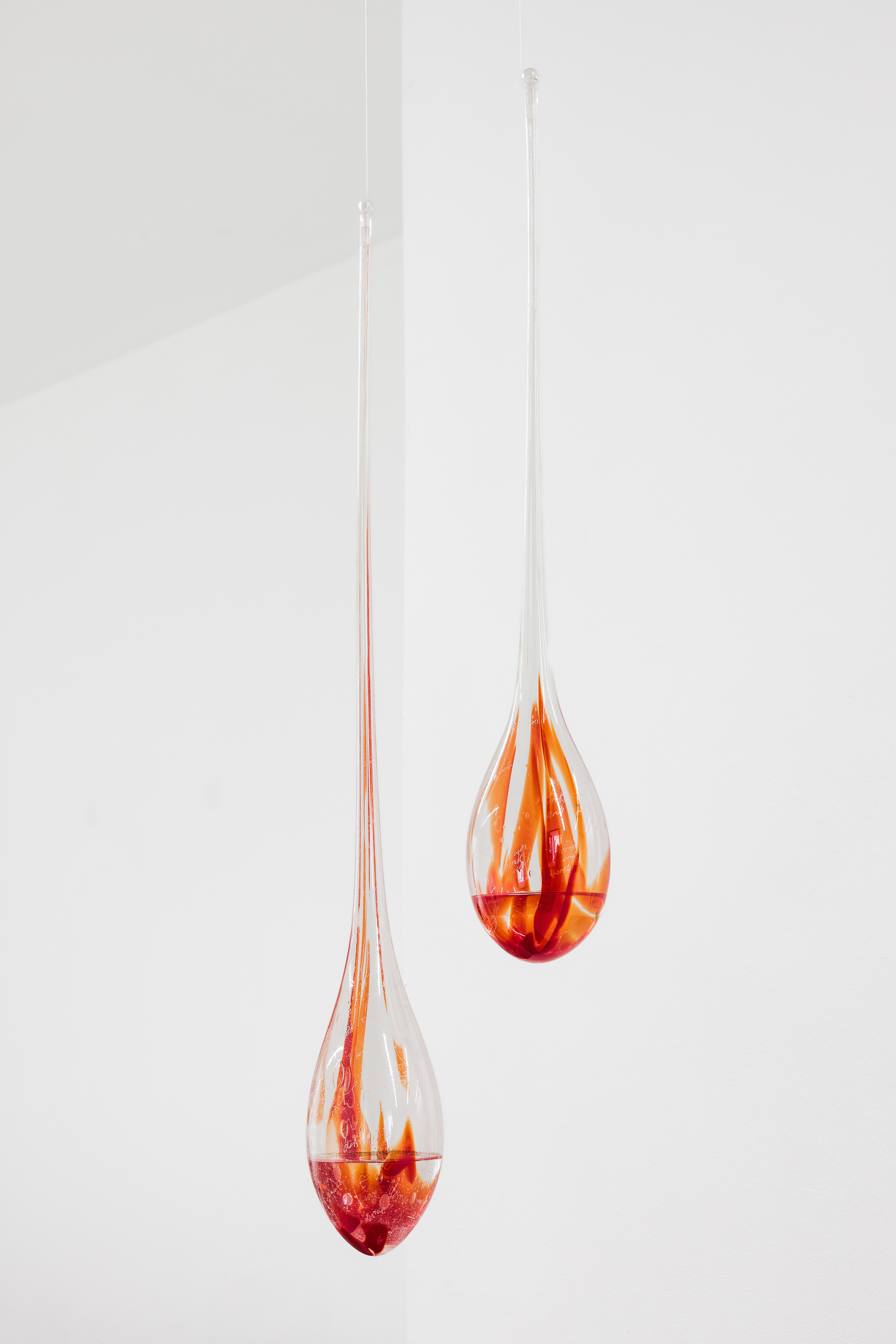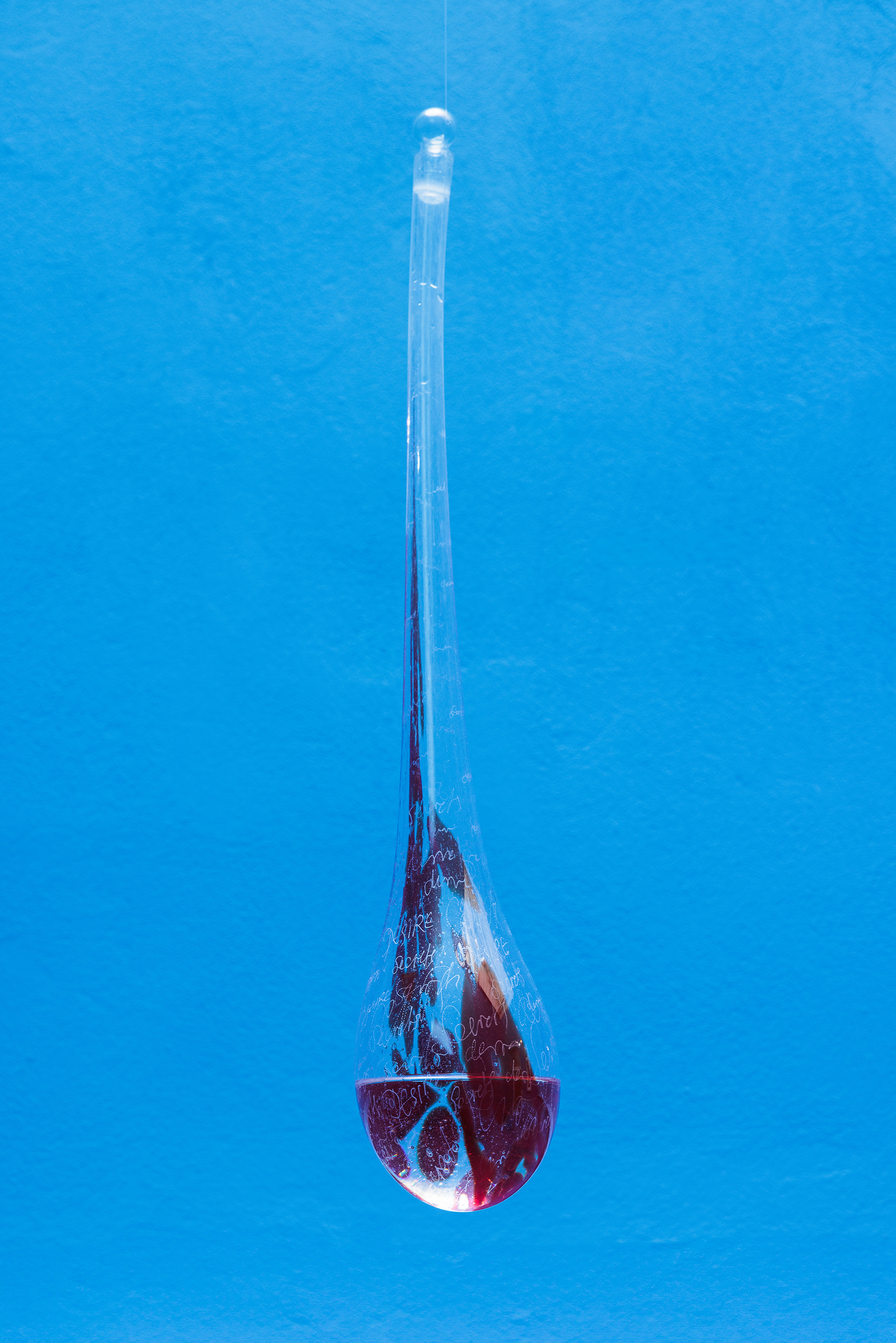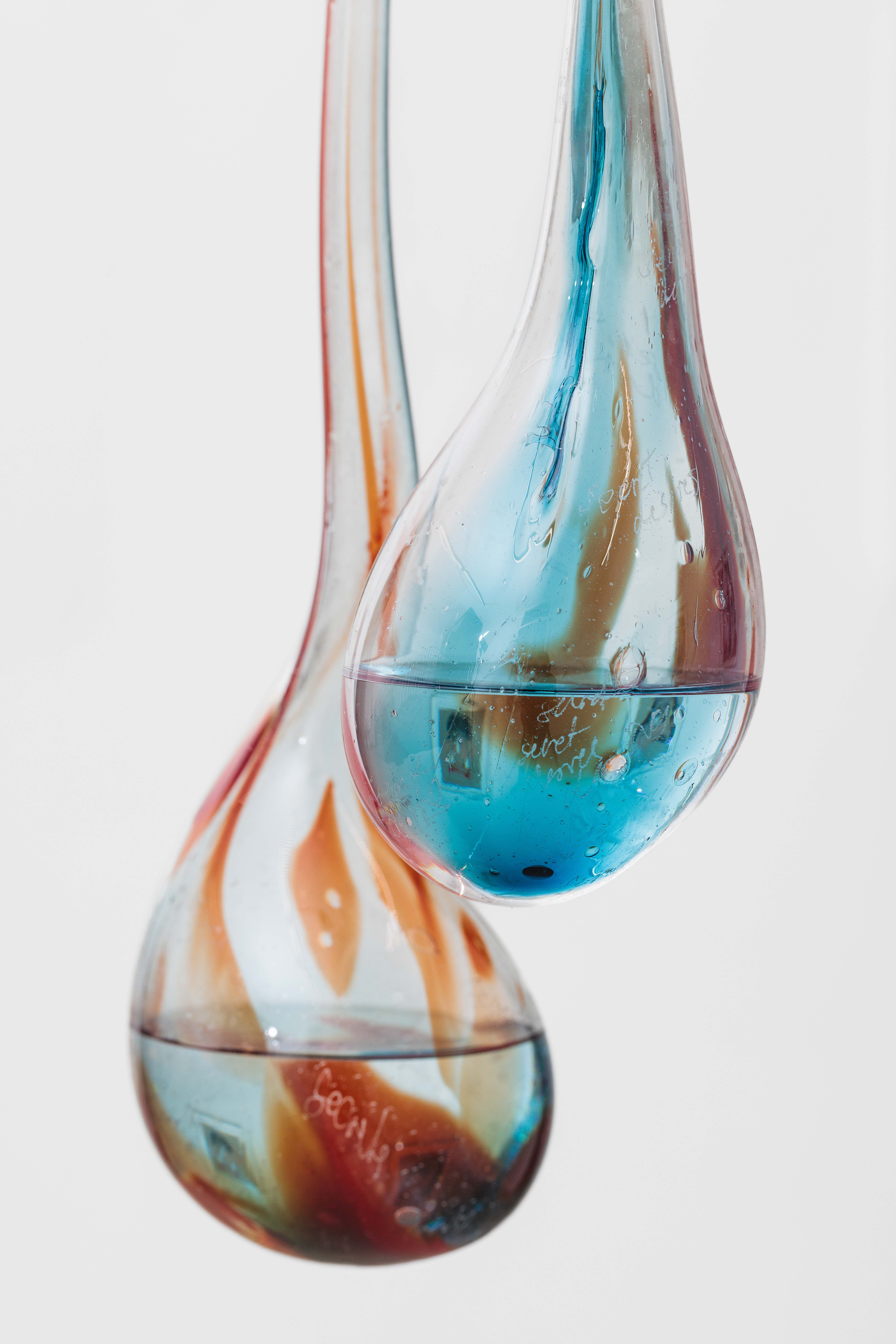 The Desiring Machines (2025) consists of individual mouth-blown ruby-red glass drops filled with ethanol and inscribed with handwritten engraved words. Fürnkäs explores the physical interstices between human and machine, masculinity and femininity. Drawing on Anti-Oedipus by Gilles Deleuze, she incorporates quotations that address the fluid processes of the body, its circulation, and its needs. The mind of the viewer and listener itself becomes a vessel in which a fluid web of its own thoughts emerges. The floating, tranquil glass droplets appear to transform into fundamental human sensations, questioning their material nature. One thing is certain: we are not our feelings — they are merely a fragment of the infinite abundance of our consciousness.