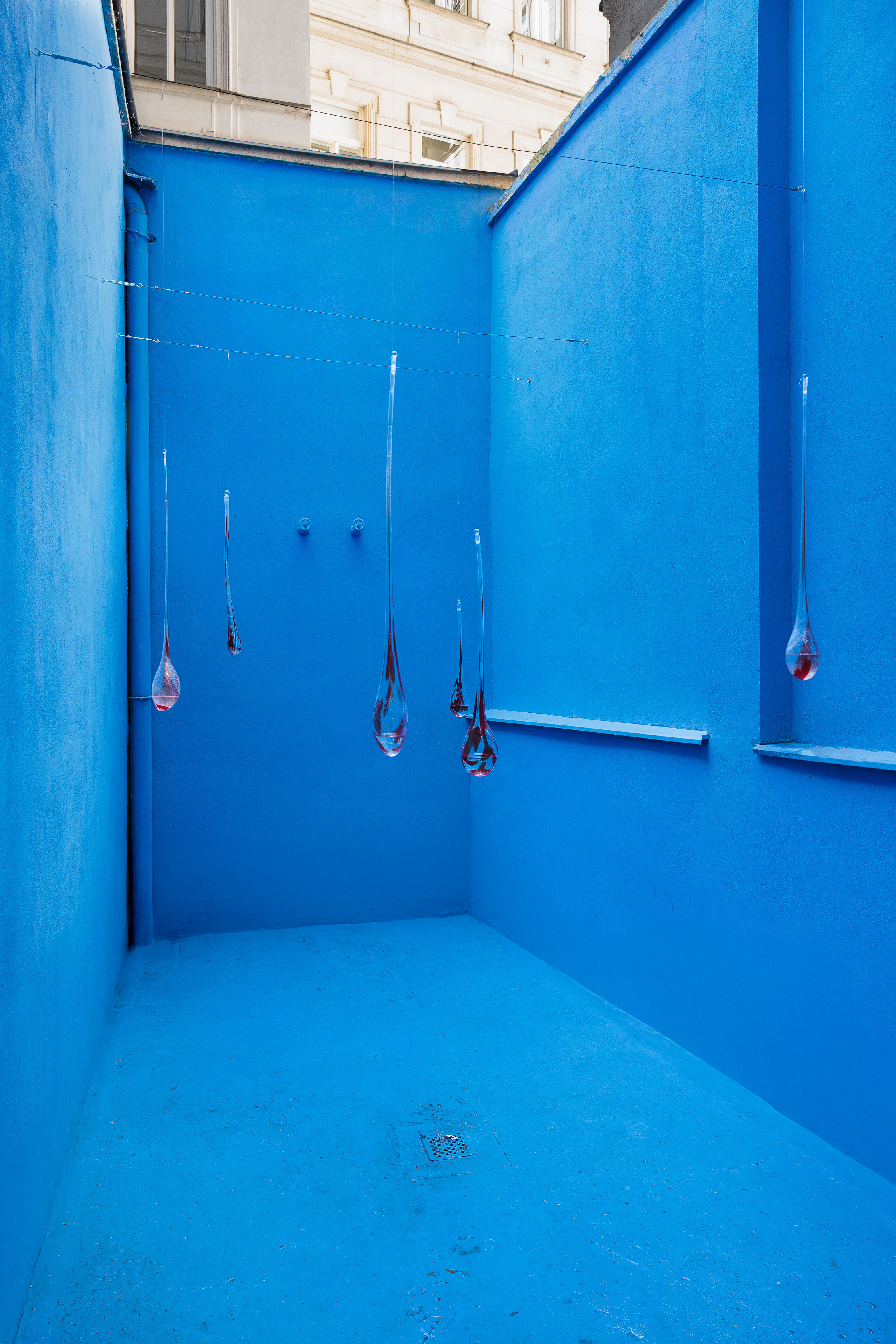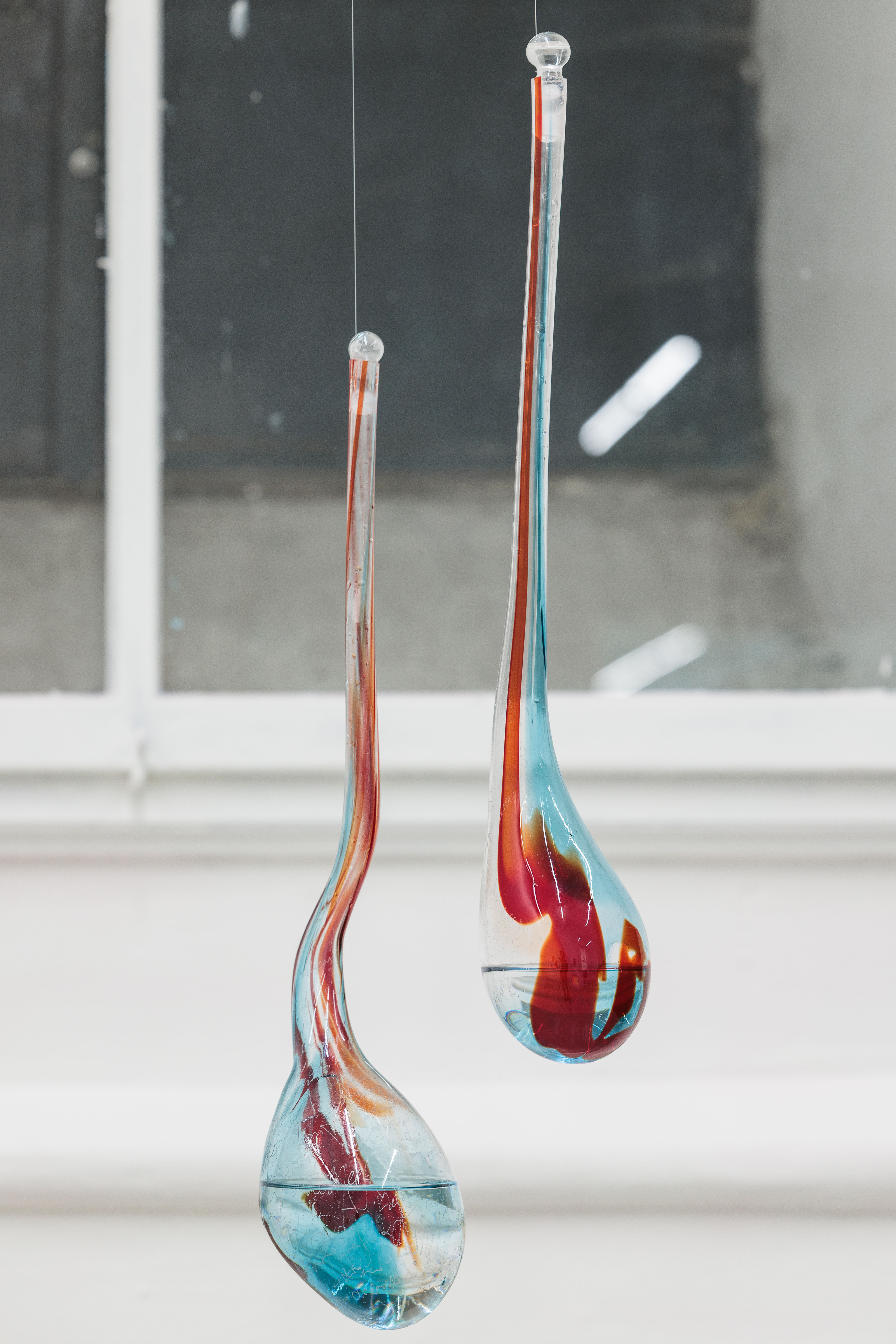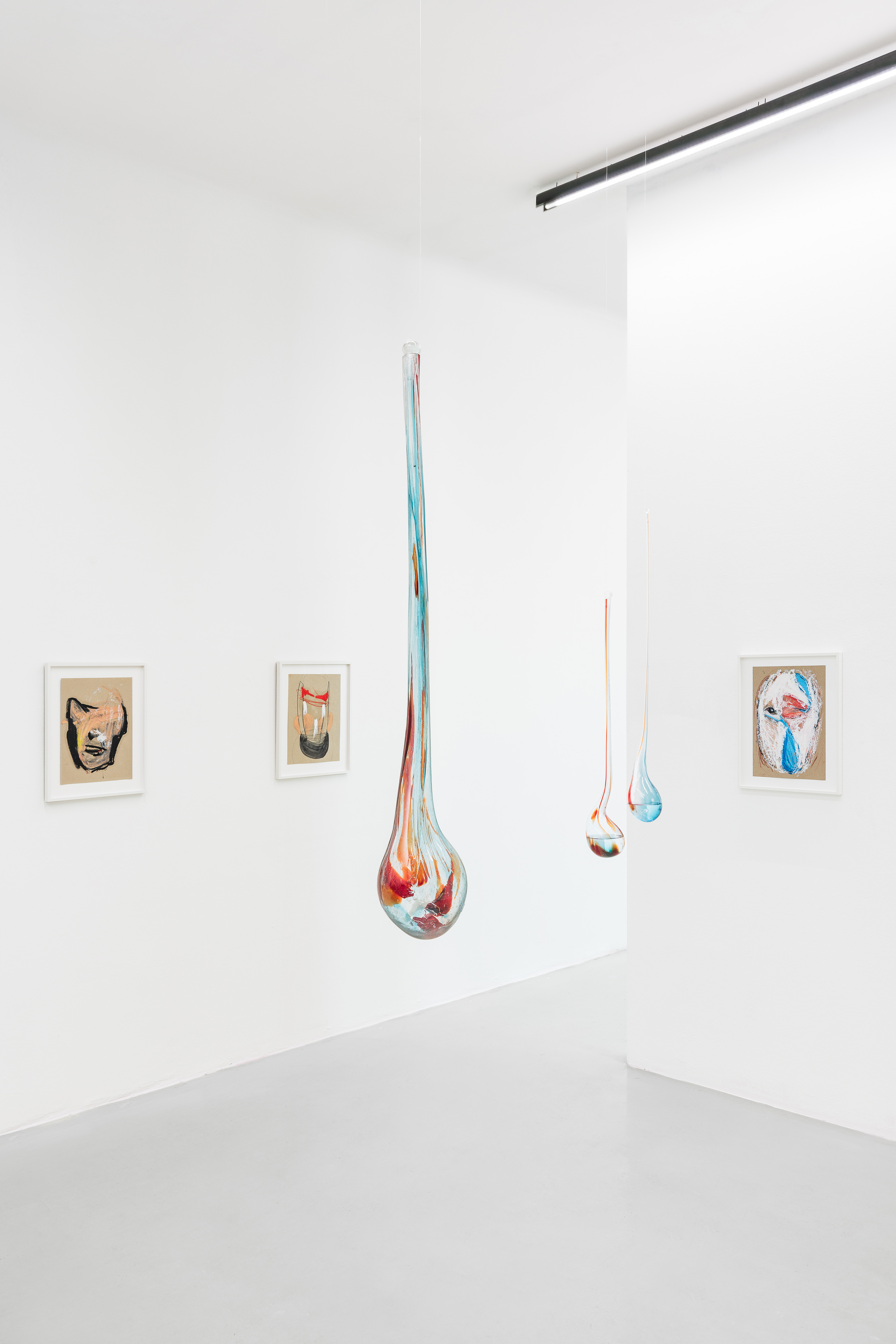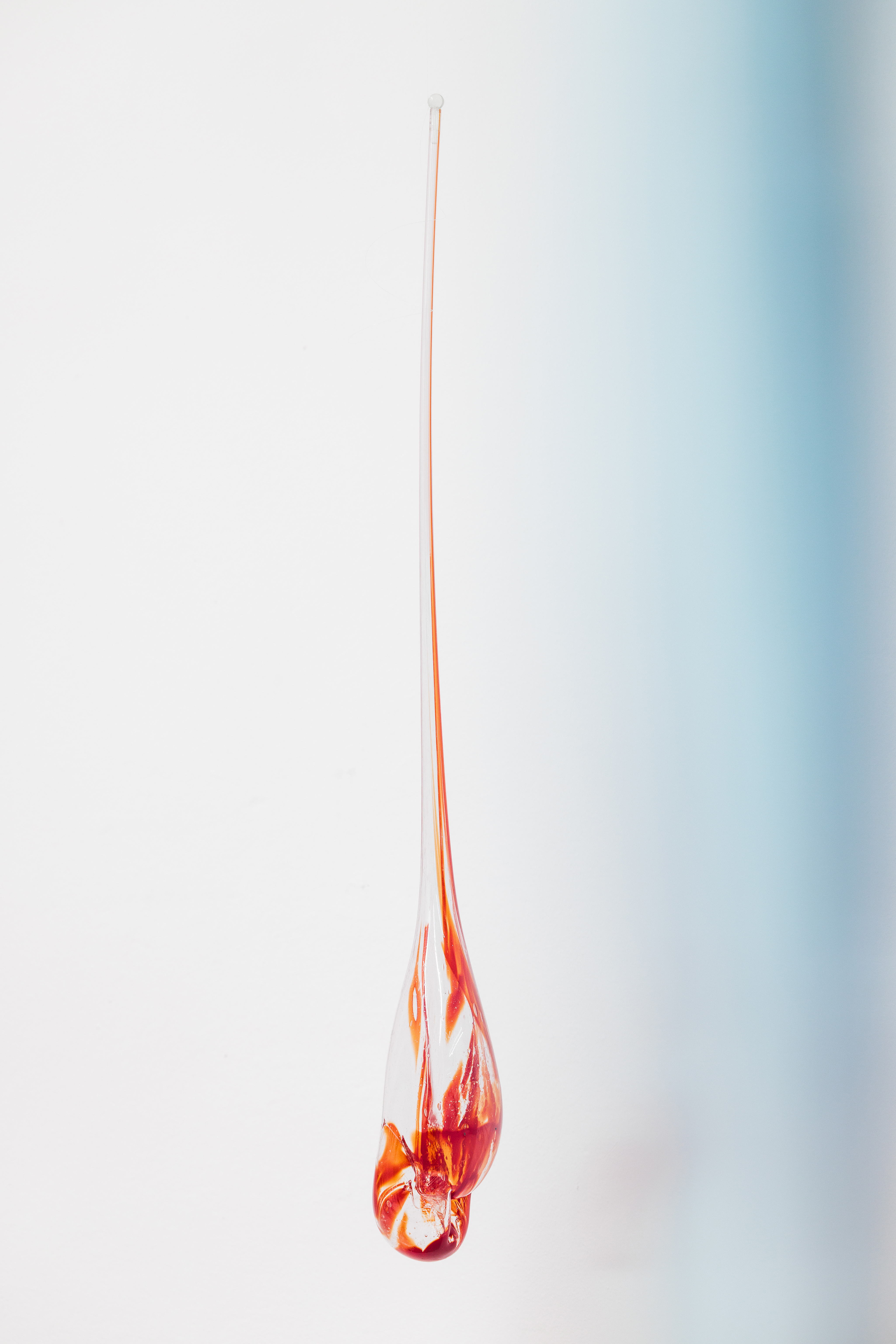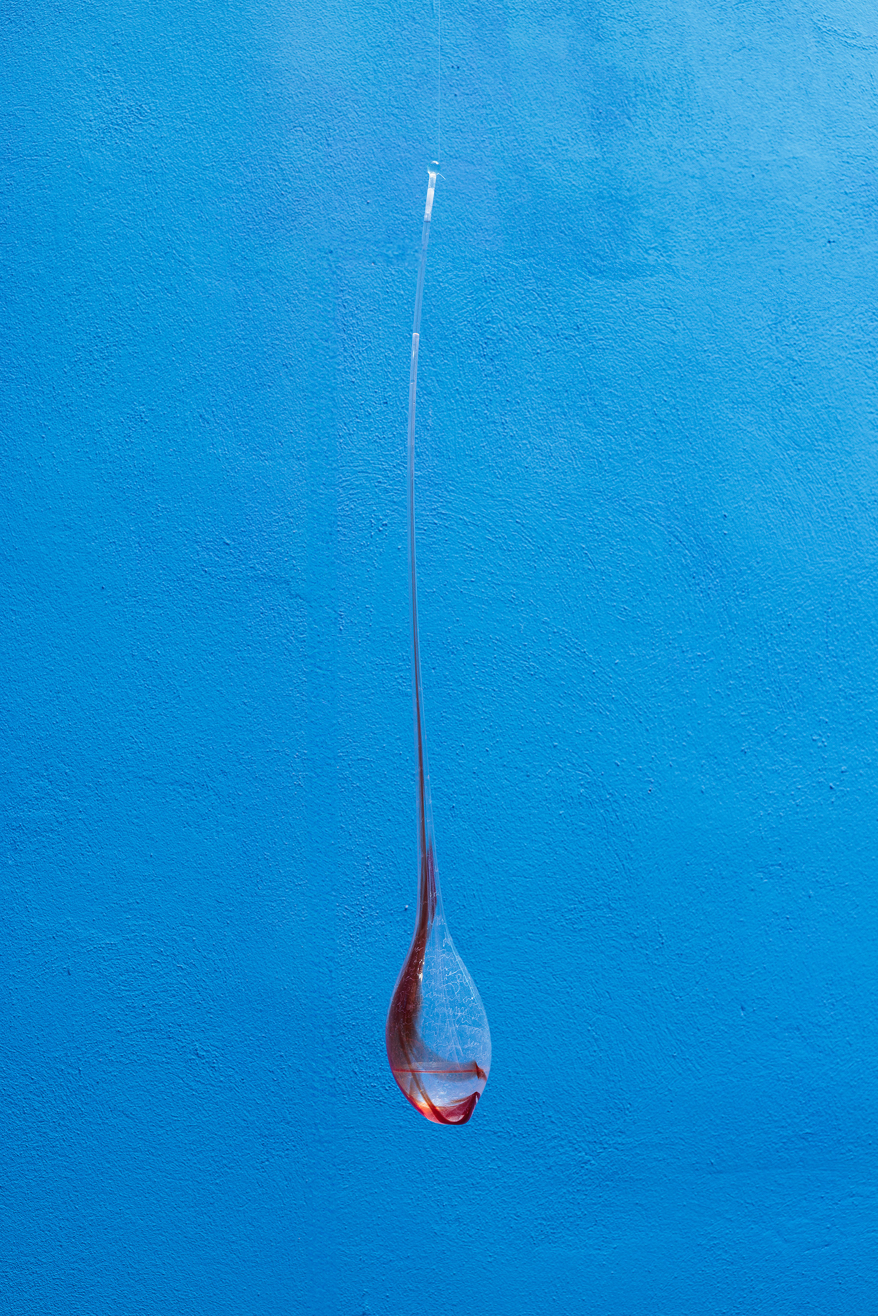 The Desiring Machines (2025) consists of individual mouth-blown ruby-red glass drops filled with ethanol and inscribed with handwritten engraved words. Fürnkäs explores the physical interstices between human and machine, masculinity and femininity. Drawing on Anti-Oedipus by Gilles Deleuze, she incorporates quotations that address the fluid processes of the body, its circulation, and its needs. The mind of the viewer and listener itself becomes a vessel in which a fluid web of its own thoughts emerges. The floating, tranquil glass droplets appear to transform into fundamental human sensations, questioning their material nature. One thing is certain: we are not our feelings — they are merely a fragment of the infinite abundance of our consciousness.