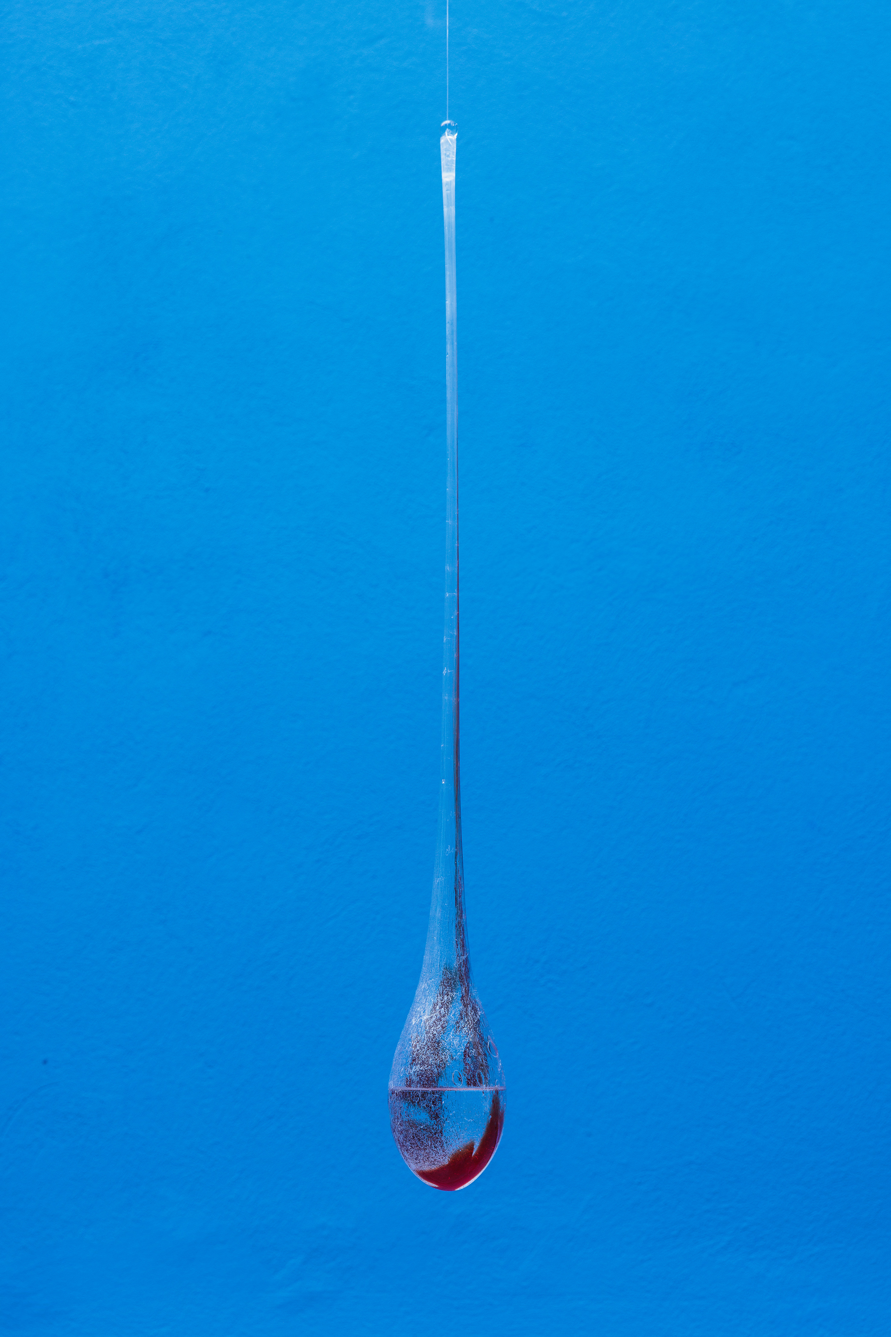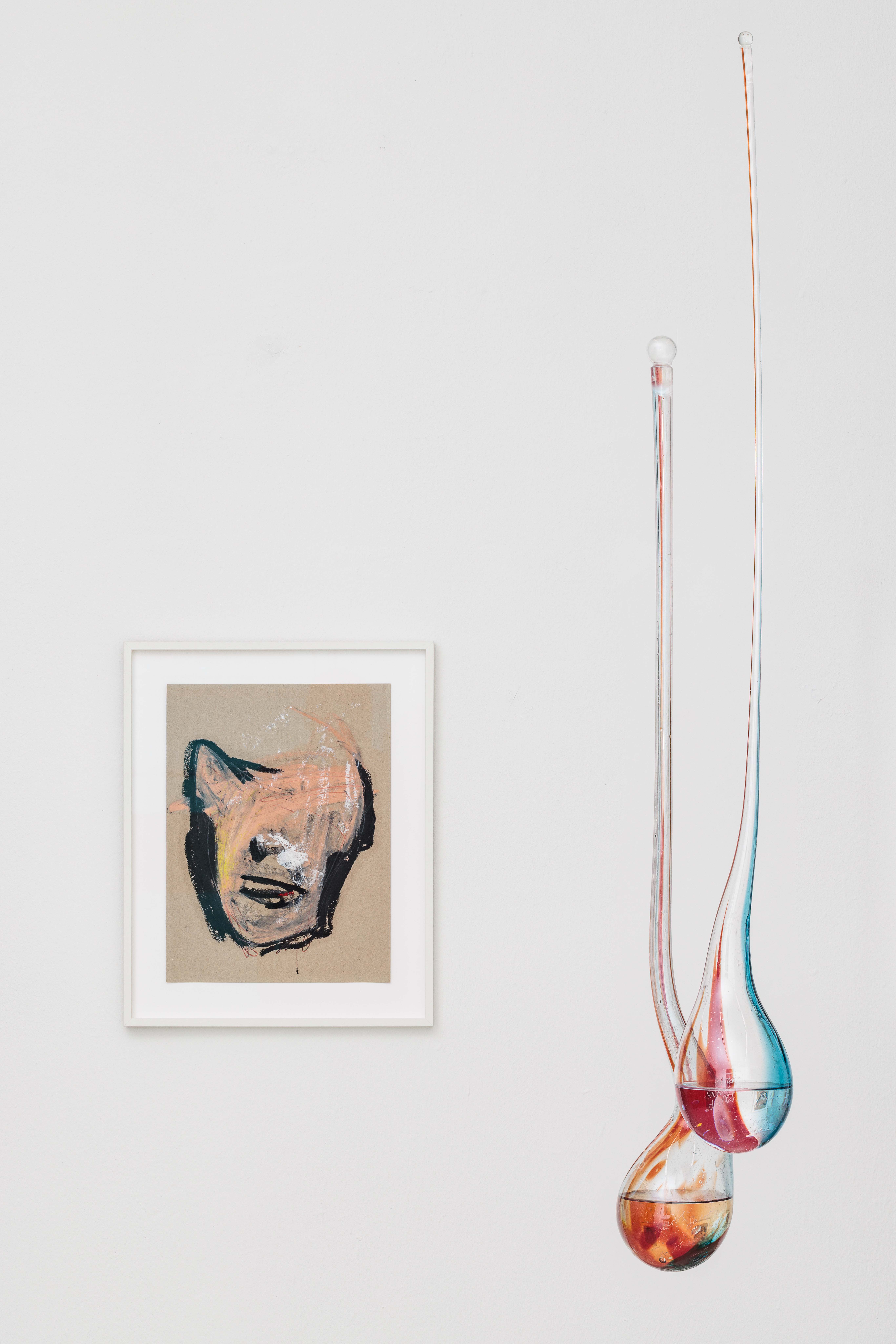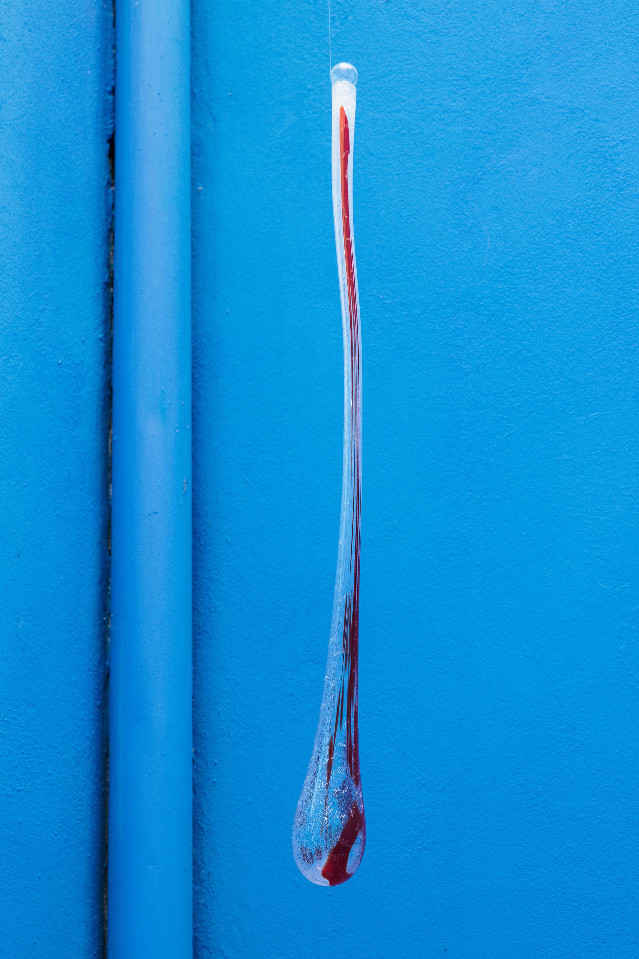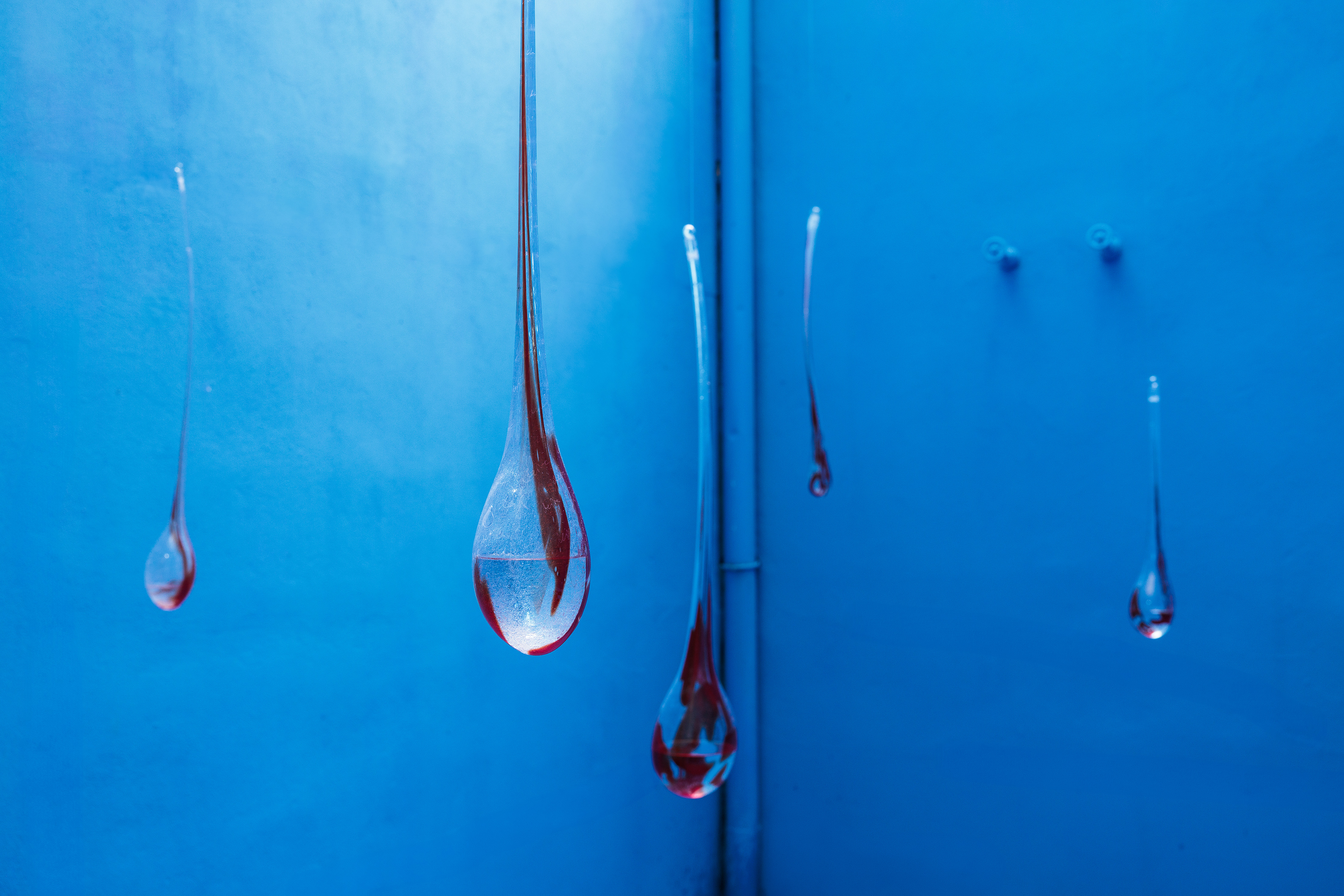 The Desiring Machines (2025) consists of individual mouth-blown ruby-red glass drops filled with ethanol and inscribed with handwritten engraved words. Fürnkäs explores the physical interstices between human and machine, masculinity and femininity. Drawing on Anti-Oedipus by Gilles Deleuze, she incorporates quotations that address the fluid processes of the body, its circulation, and its needs. The mind of the viewer and listener itself becomes a vessel in which a fluid web of its own thoughts emerges. The floating, tranquil glass droplets appear to transform into fundamental human sensations, questioning their material nature. One thing is certain: we are not our feelings — they are merely a fragment of the infinite abundance of our consciousness.