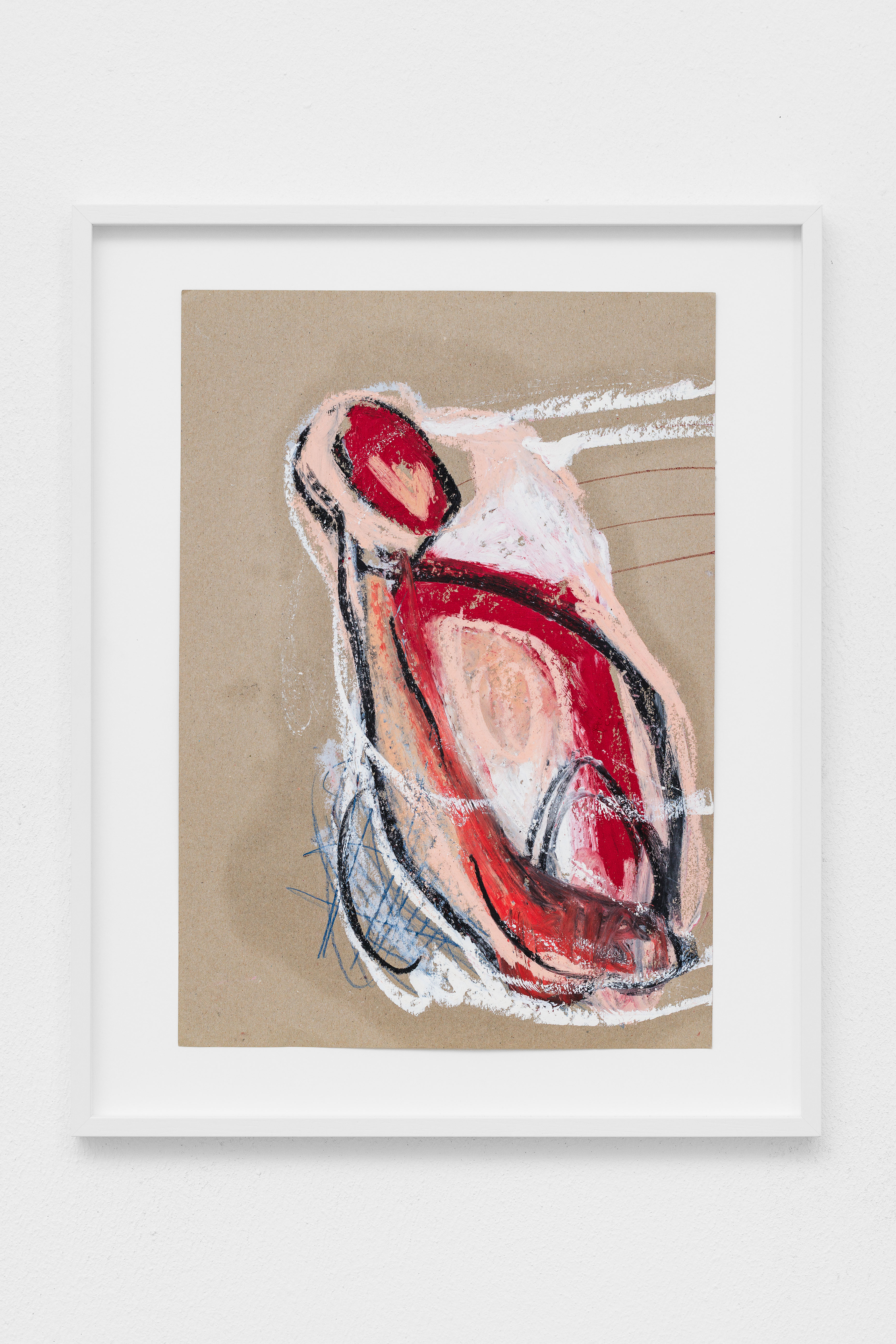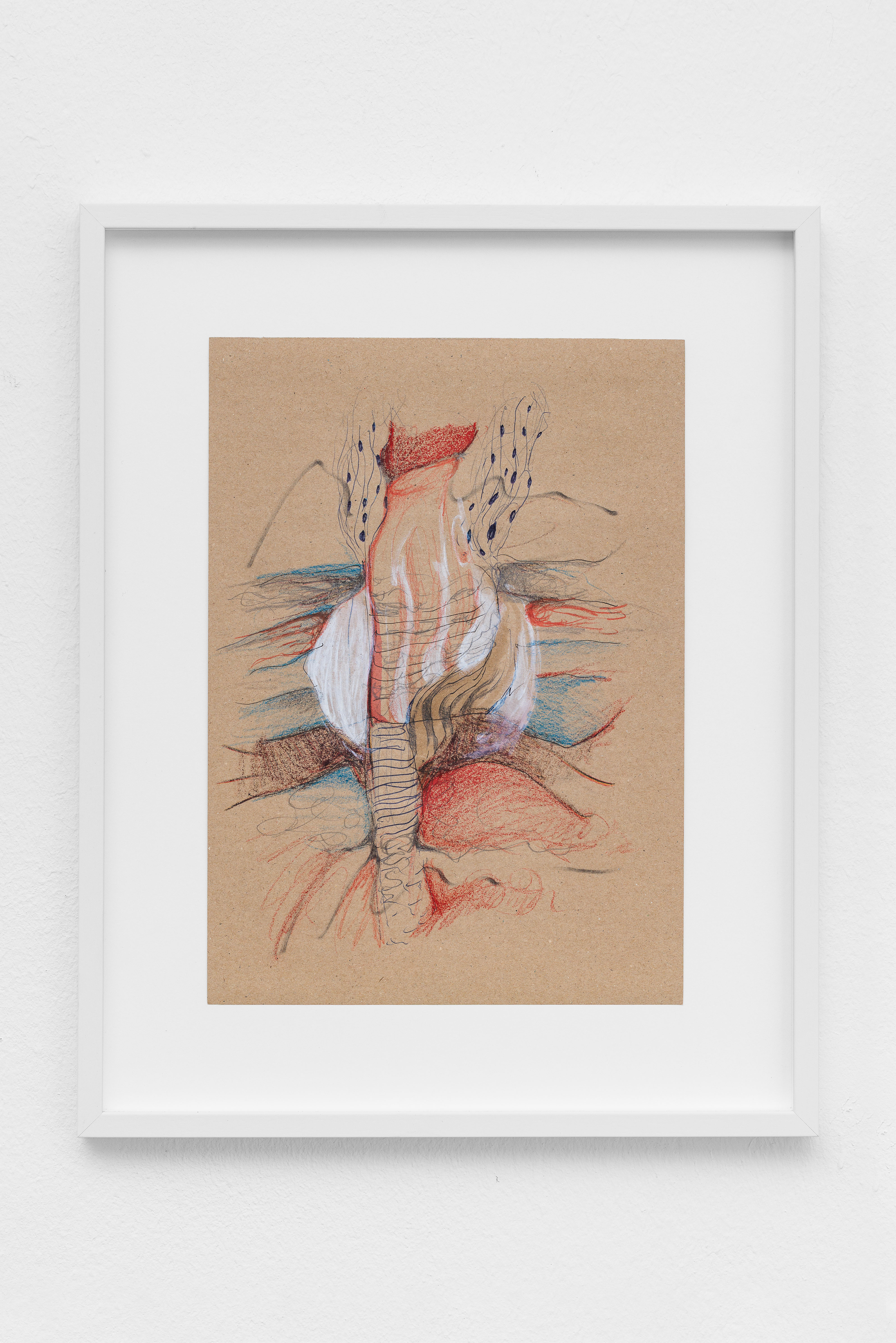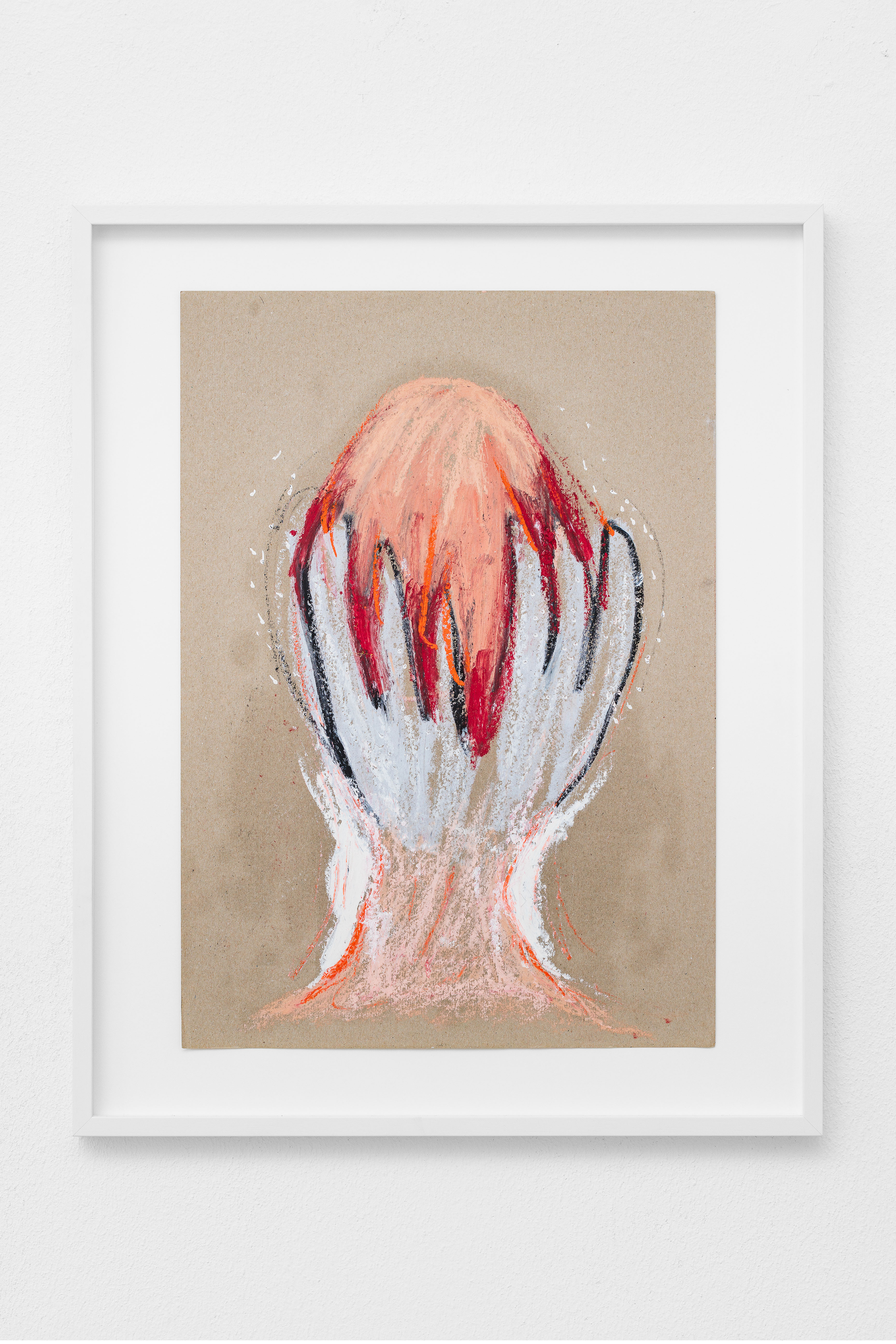 Interiorities (2024–2025) is a series of mixed-media works on paper, executed in oil pastels. Fürnkäs’ drawing series Interiorities plays on a sense of suspension — the suspension of pigment in oil, the suspension of reality in favour of raw emotion. One after the other, formless figures tending towards abstraction cover sheets of brown paper. Hands, faces; gaping mouths, open wounds. Through pure gesturality and colour, the drawings somehow articulate a language of their own. Each drawing adds phonemes, words, punctuation — in this way constructing a broader cosmos of meaning. It’s a primal language, a mother tongue, the kind that isn’t learned on an intellectual level, but rather an emotional and intuitive one. The kind whose rules and grammar you can’t explain — you just, inexplicably, know.