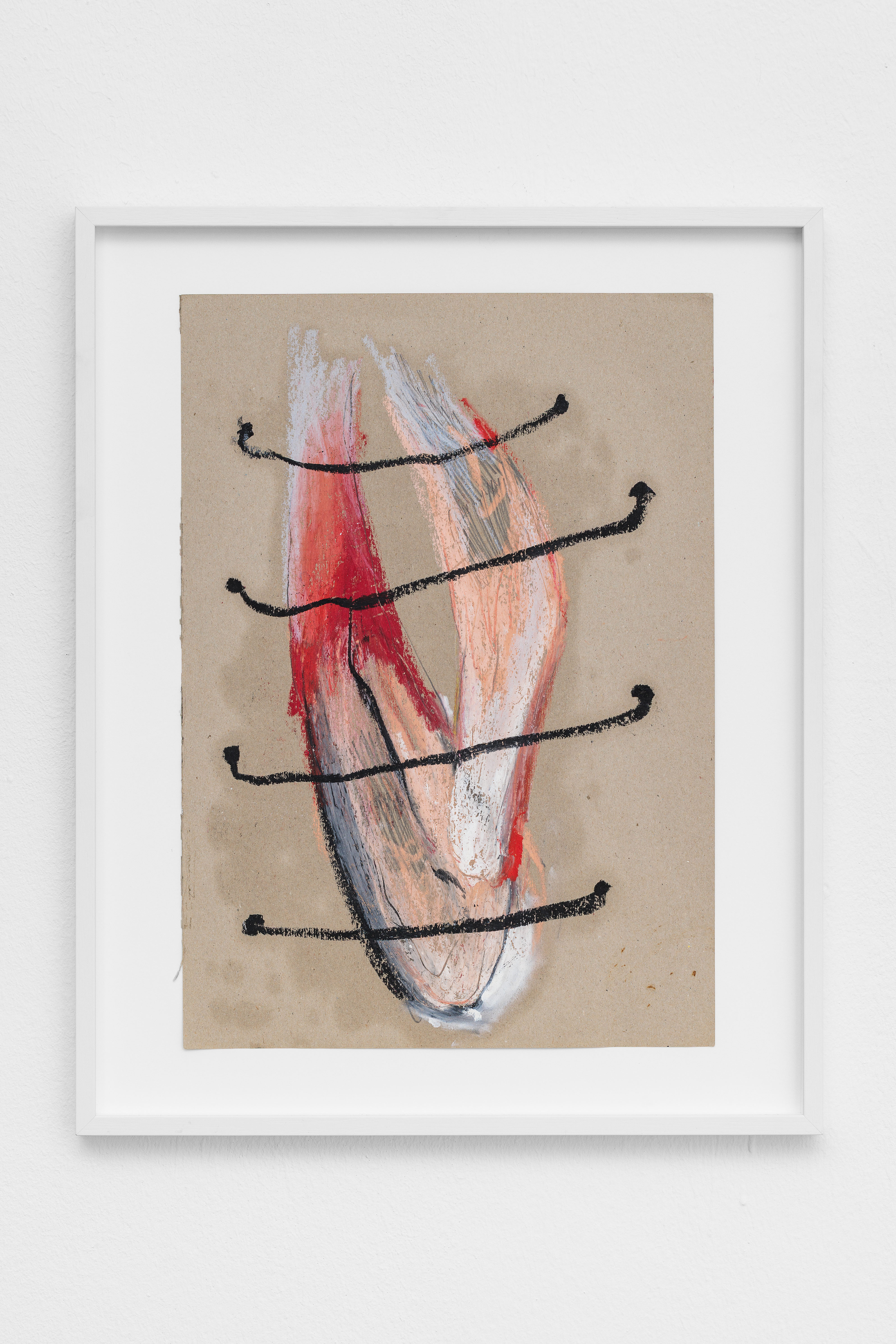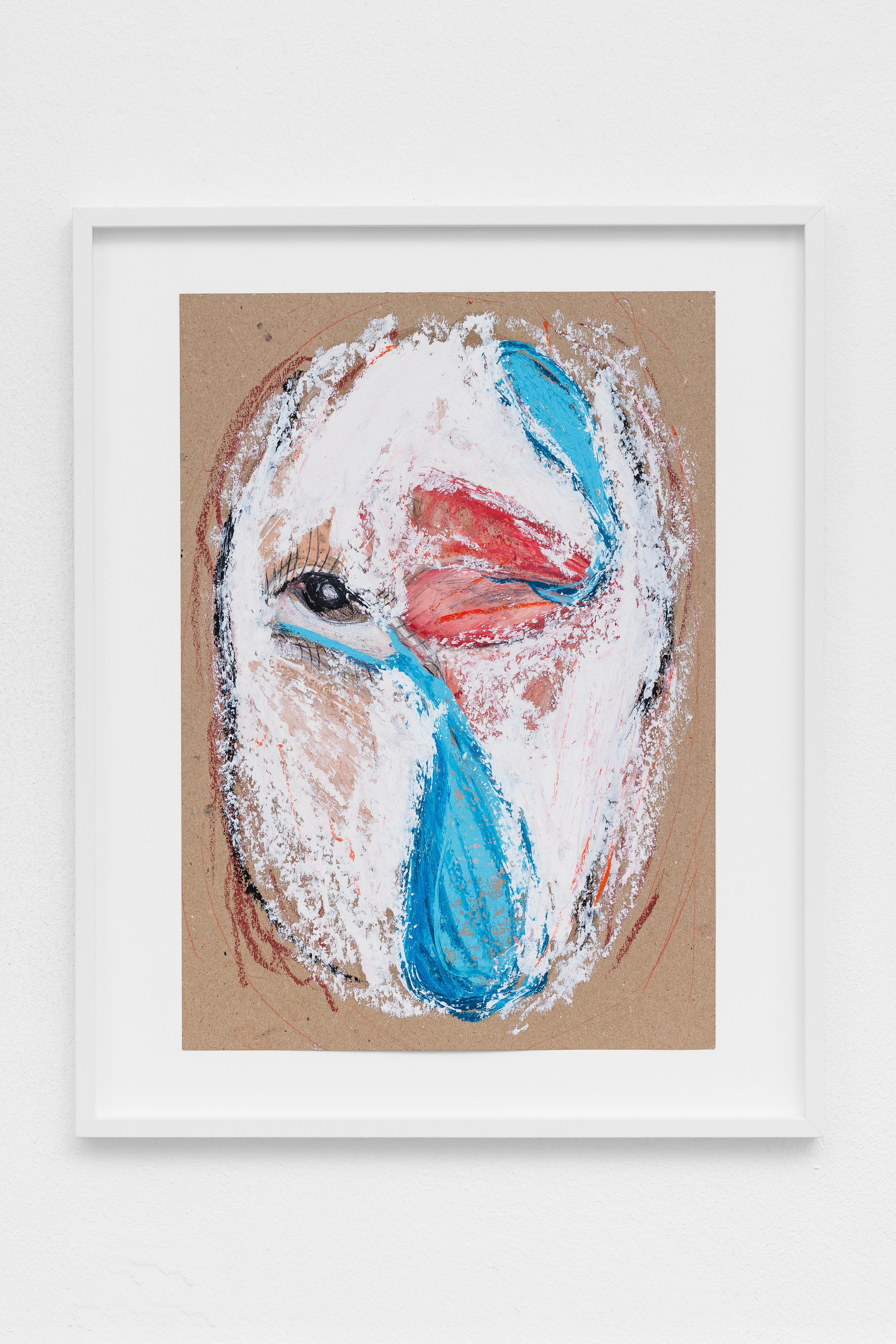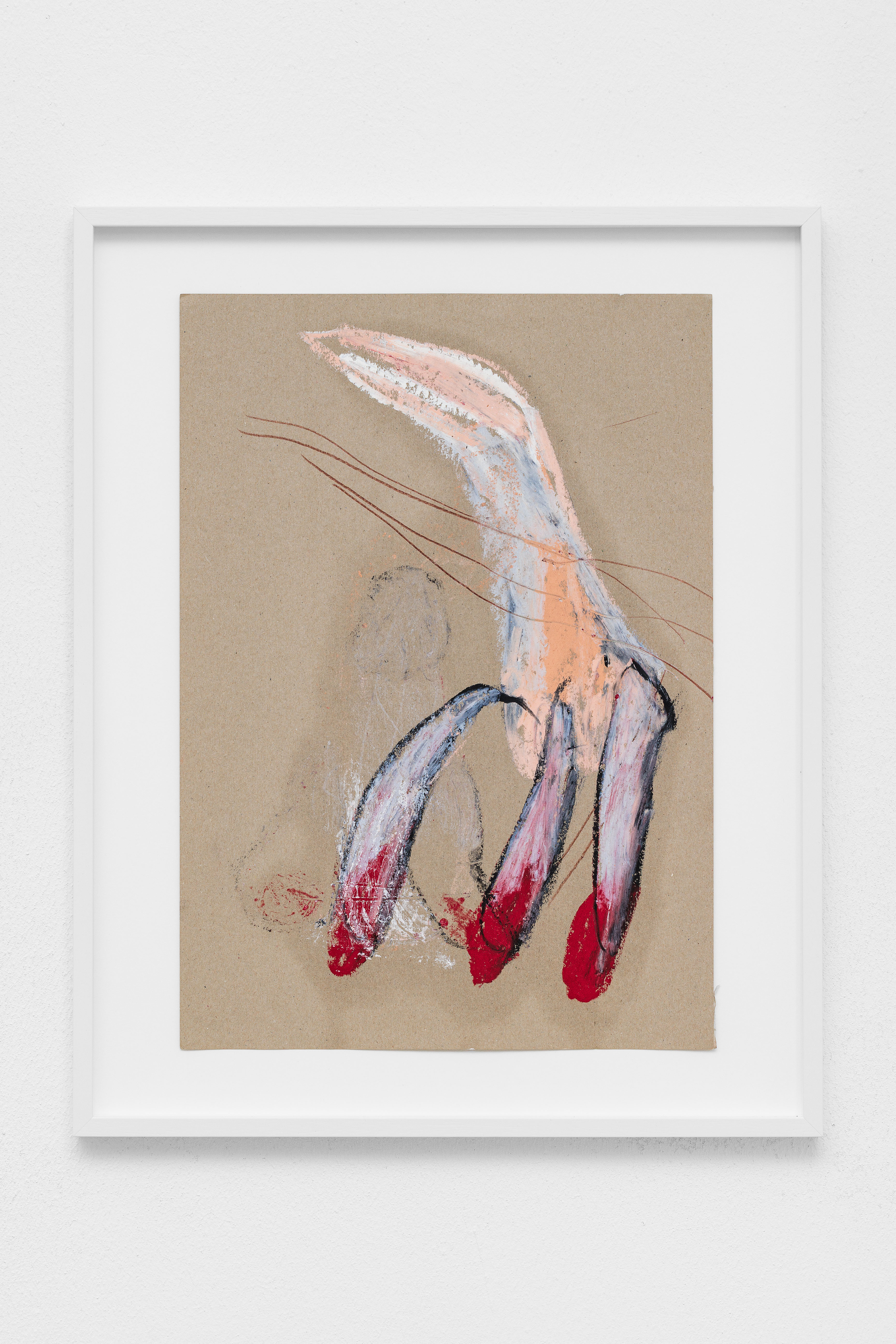 Interiorities (2024–2025) is a series of mixed-media works on paper, executed in oil pastels. Fürnkäs’ drawing series Interiorities plays on a sense of suspension — the suspension of pigment in oil, the suspension of reality in favour of raw emotion. One after the other, formless figures tending towards abstraction cover sheets of brown paper. Hands, faces; gaping mouths, open wounds. Through pure gesturality and colour, the drawings somehow articulate a language of their own. Each drawing adds phonemes, words, punctuation — in this way constructing a broader cosmos of meaning. It’s a primal language, a mother tongue, the kind that isn’t learned on an intellectual level, but rather an emotional and intuitive one. The kind whose rules and grammar you can’t explain — you just, inexplicably, know.
