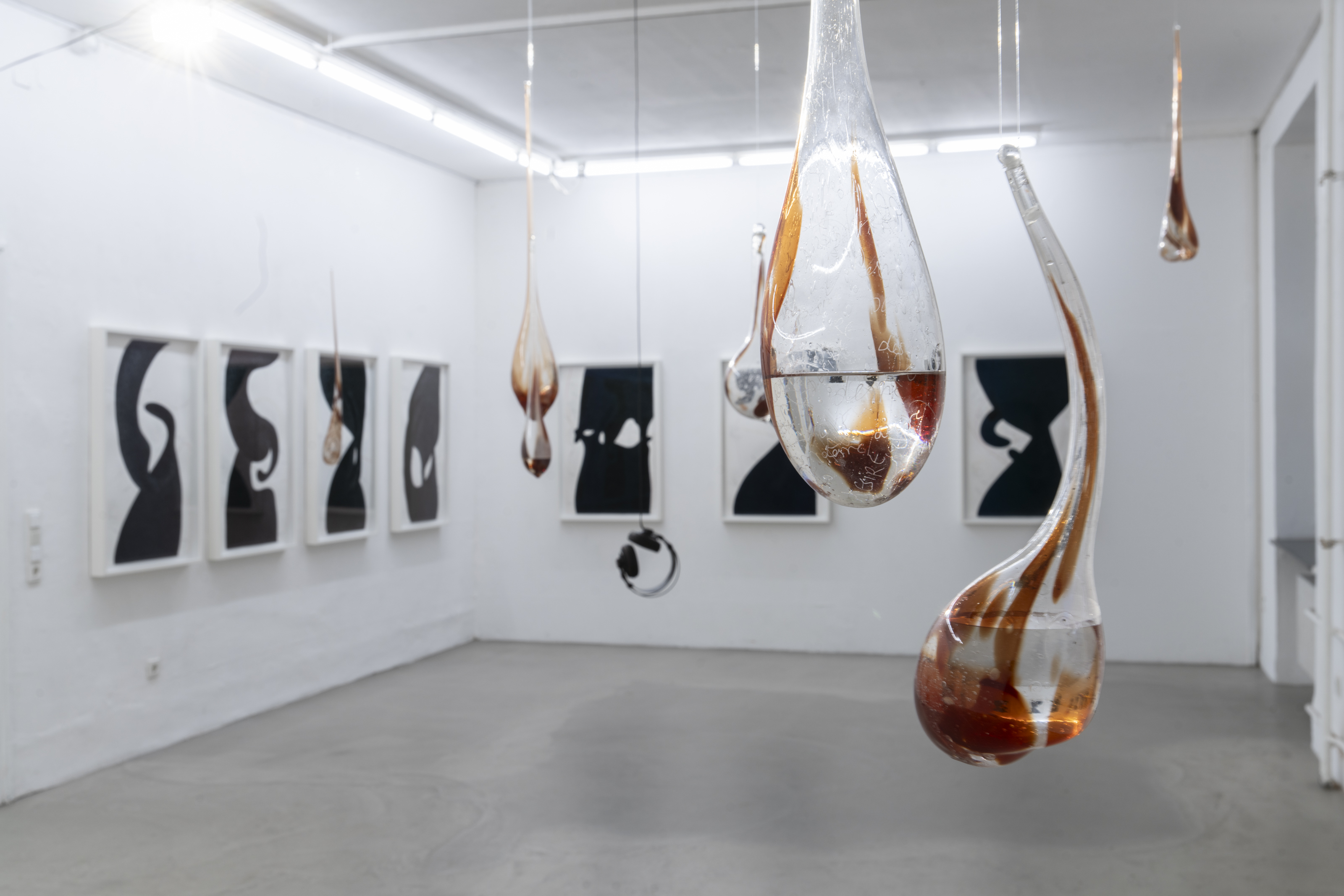 Isabella Fürnkäs explores the physical interstices between human and machine, masculinity and femininity. Drawing on Anti-Oedipus by Gilles Deleuze, she incorporates quotations that address the fluid processes of the body, its circulation, and its needs. It seems as though the "male thought" takes on a new form through the female voice of Moira Barrett—transformed and repositioned. The mind of the viewer and listener itself becomes a vessel in which a fluid web of its own thoughts emerges. The floating, tranquil glass droplets appear to transform into fundamental human sensations, questioning their material nature. One thing is certain: we are not our feelings—they are merely a fragment of the infinite abundance of our consciousness.