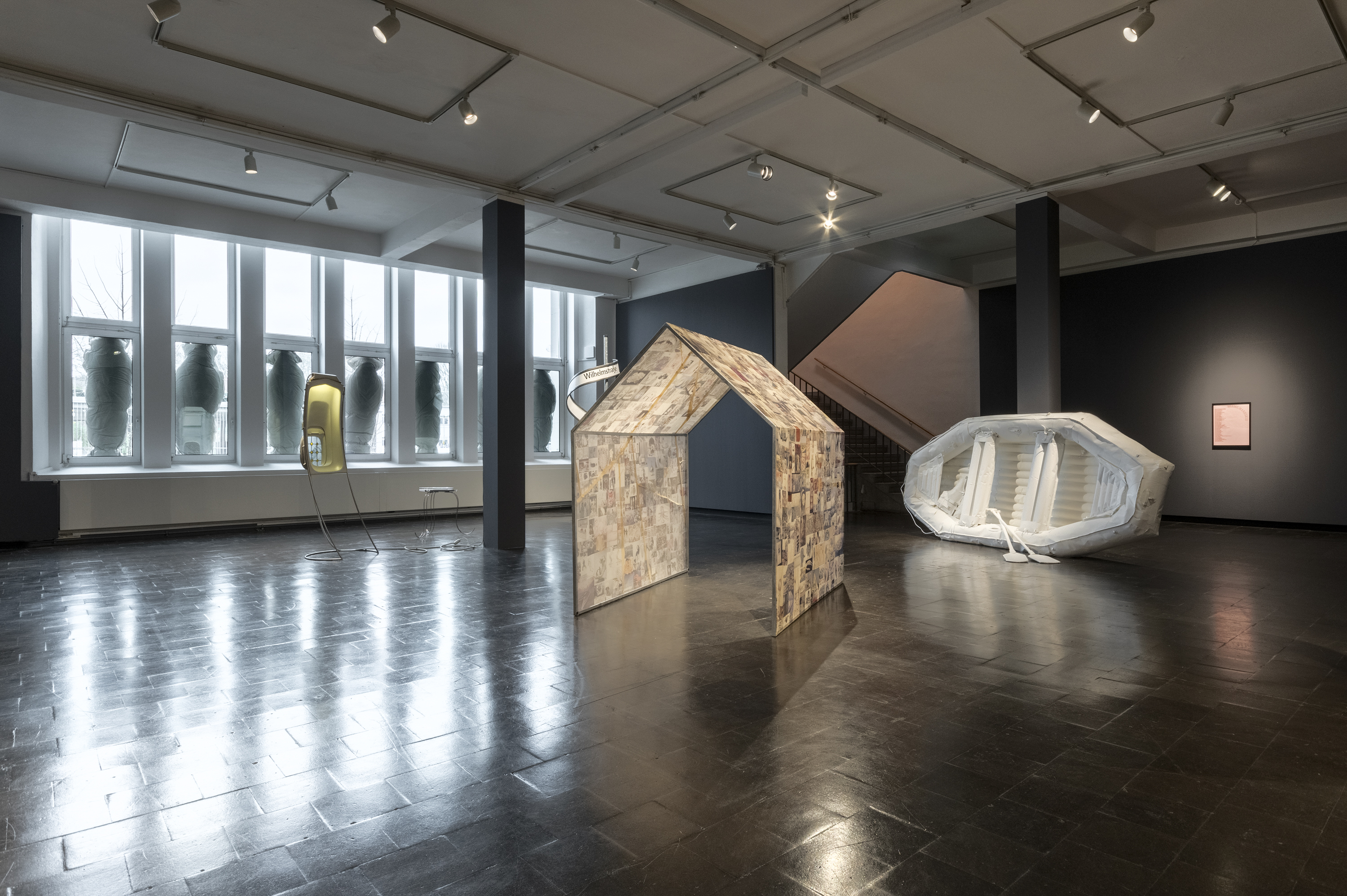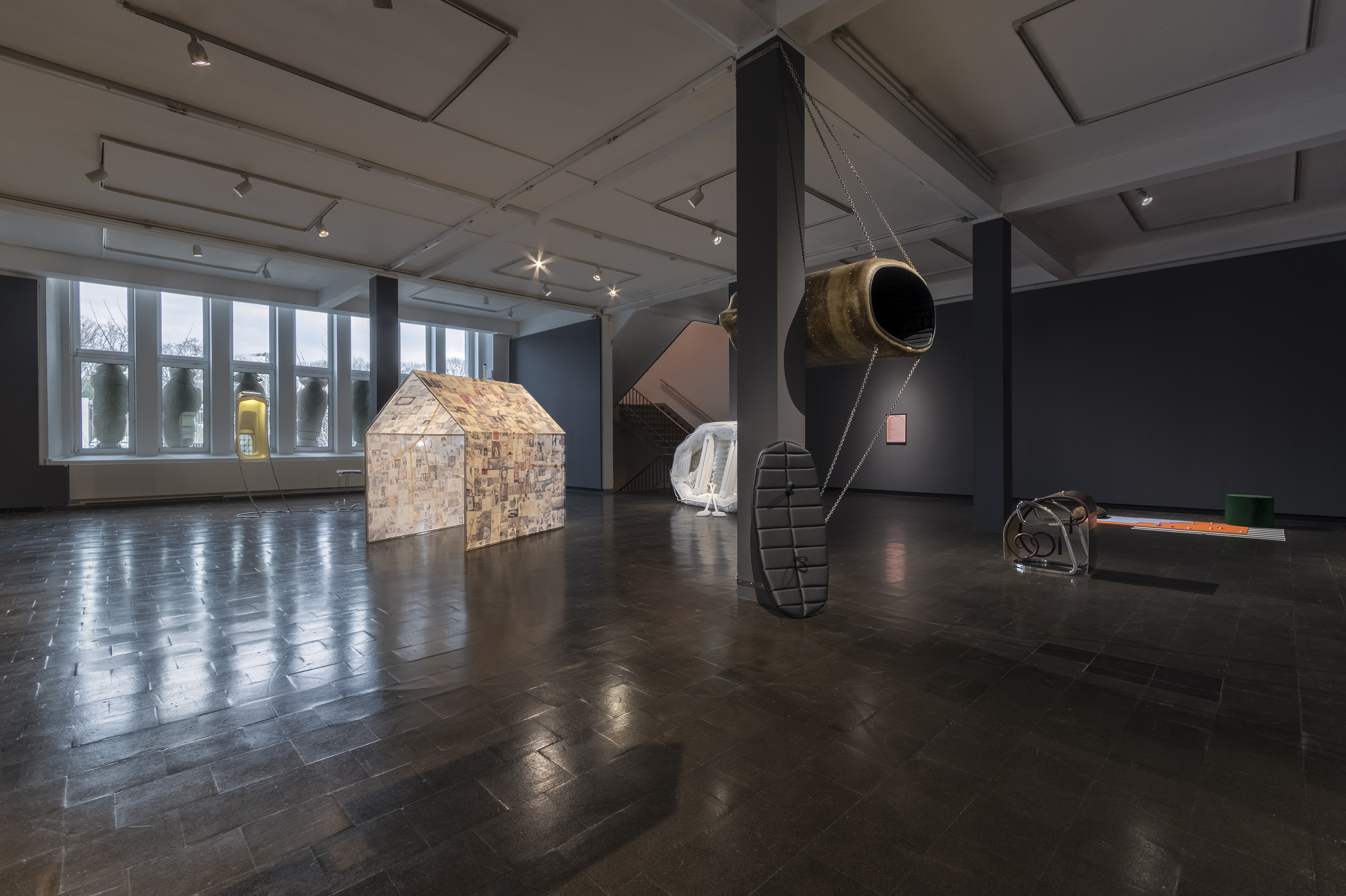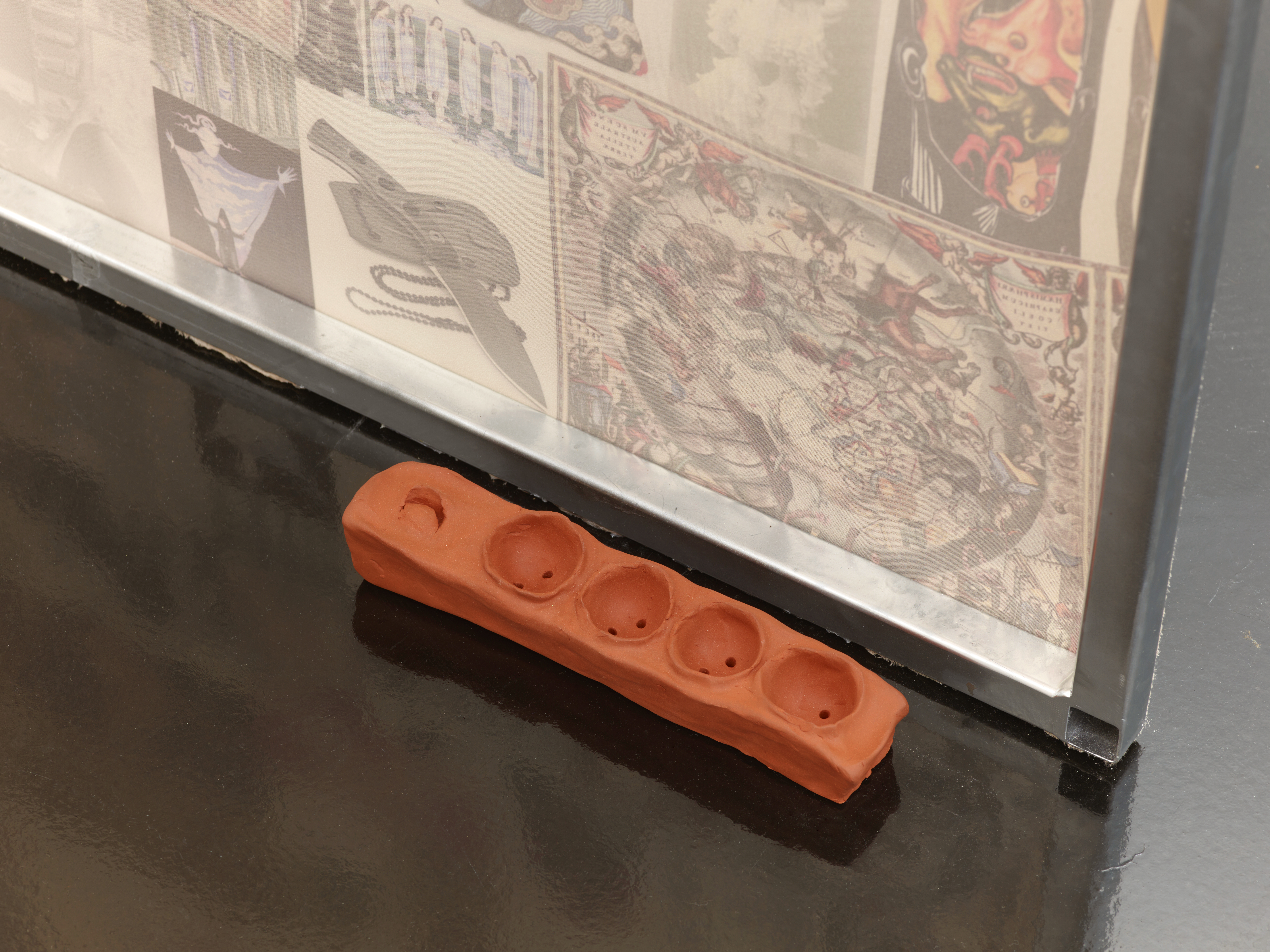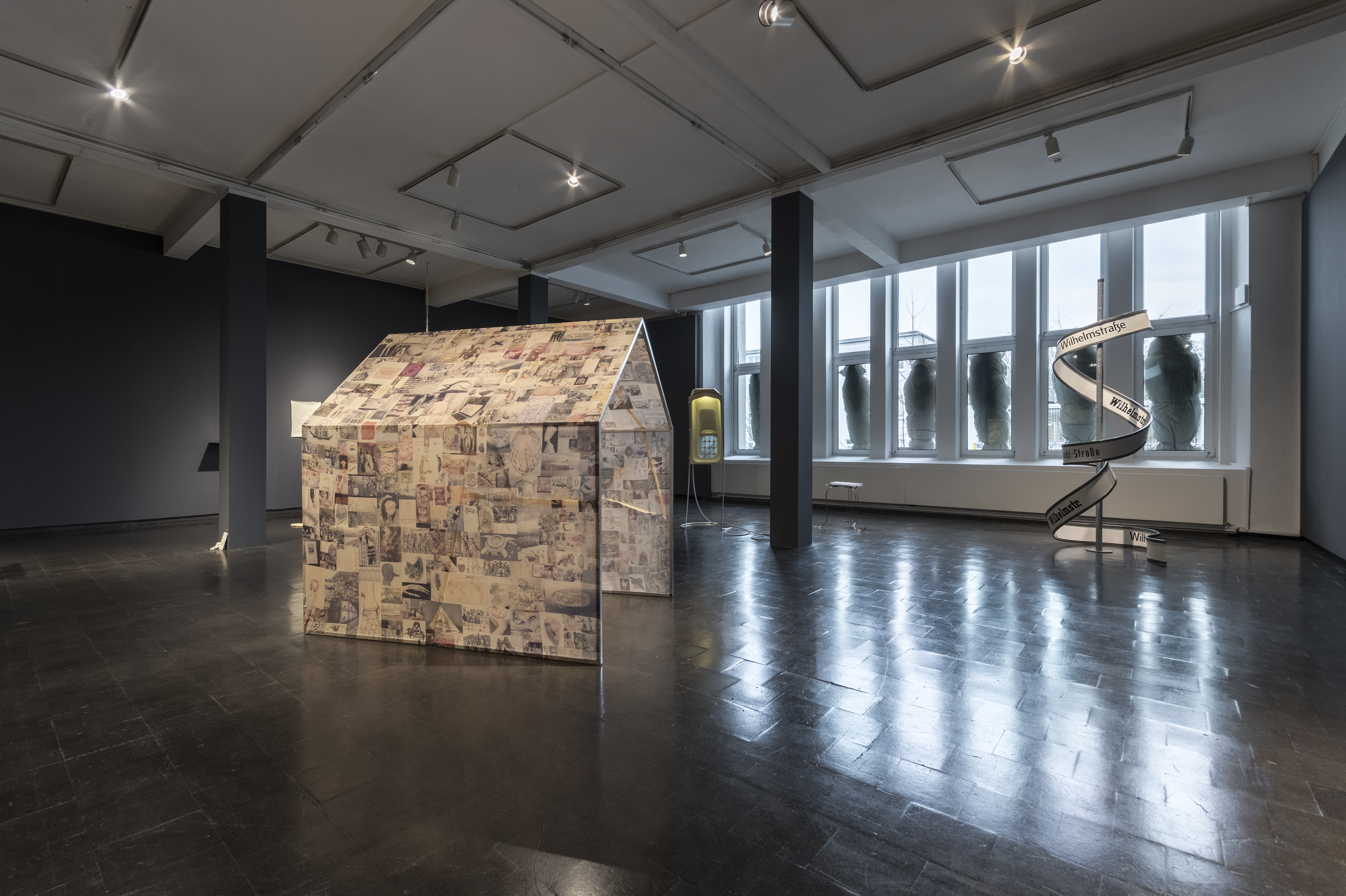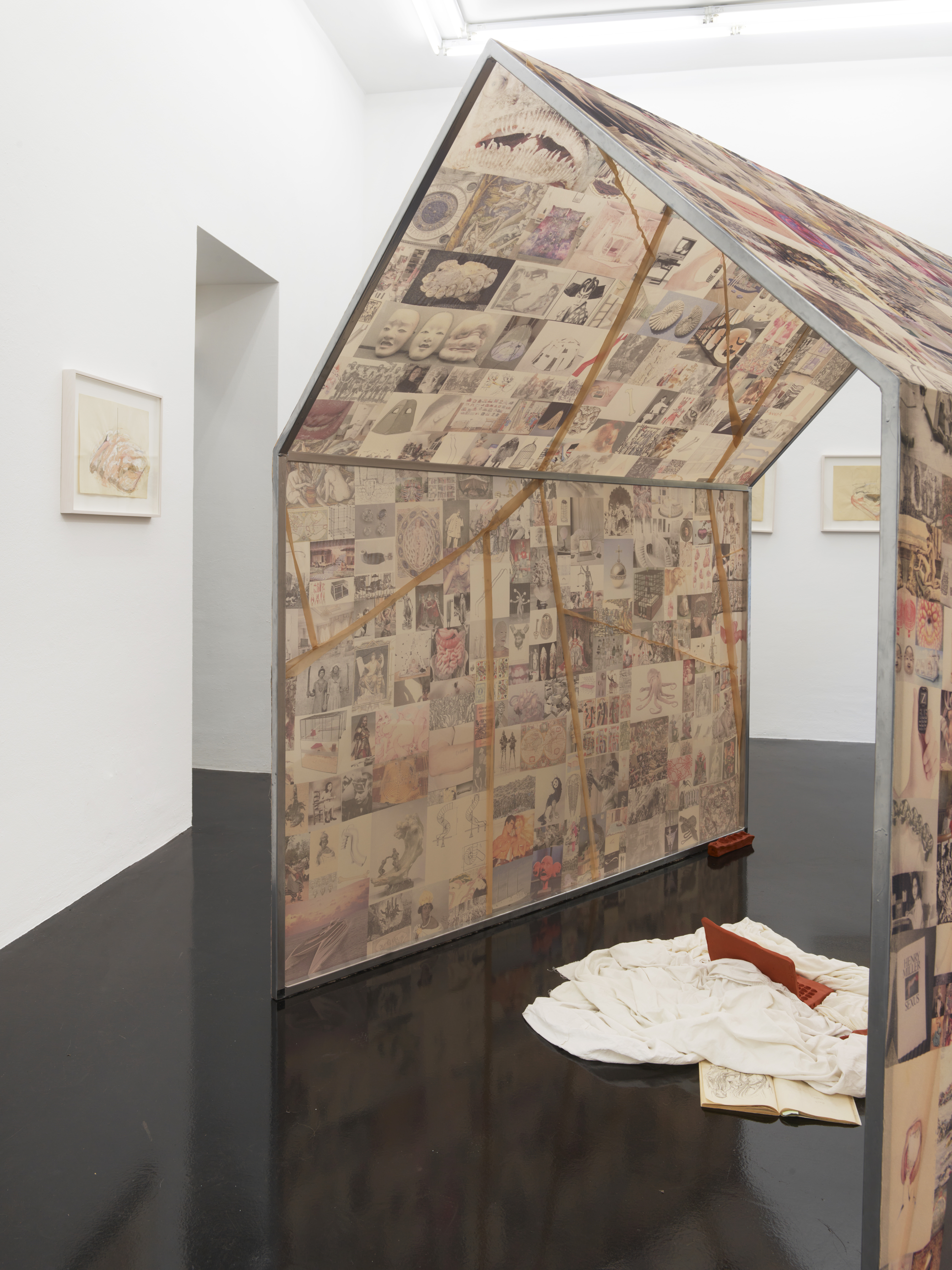 [..] Remember how you used to build pillow fortresses as a child? The Memory House (2023) in the first room is similarly comforting (at first glance at least). Inside, electric outlets and a notebook made up of ceramics are draped in white bed sheets. A sketchbook peeks out. The outer shell of the house is full of images: naked cats, artworks, anatomic illustrations, product designs, porn.